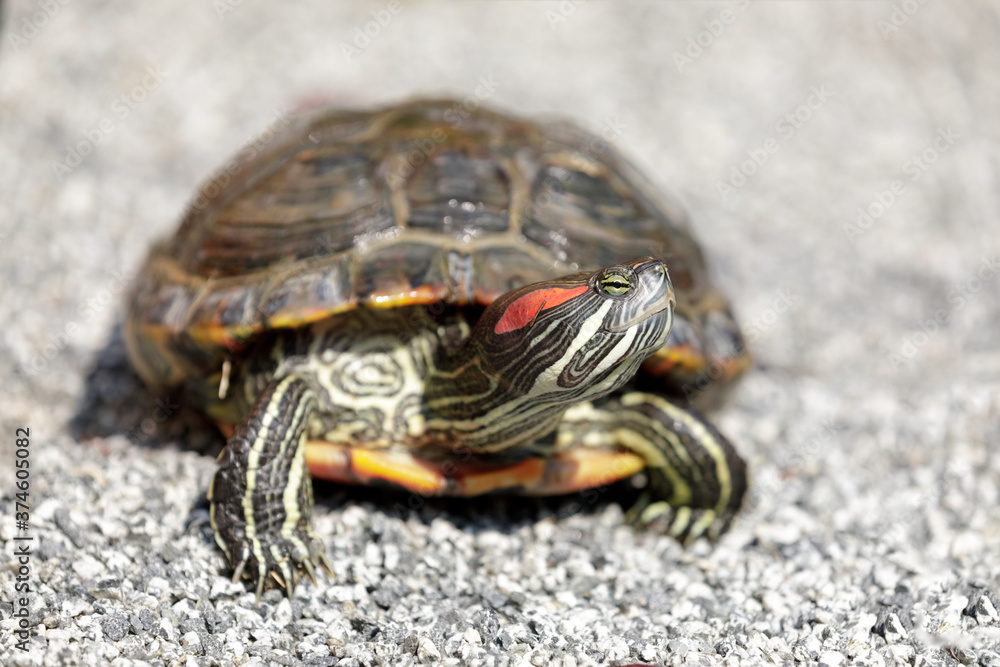 Red-eared slider turtle on gravel in backyard in Northern California.