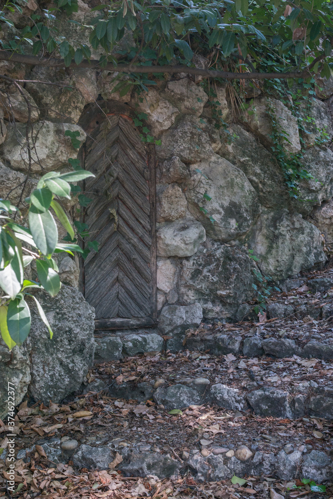 drzwi drewniane mur liście kamienie schody