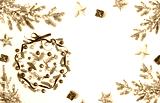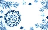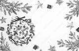 Christmas composition with red ribbon ,branches of fir tree and Christmas ornaments in shape of Christmas bauble on white background.