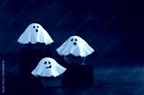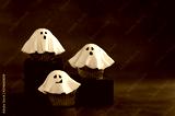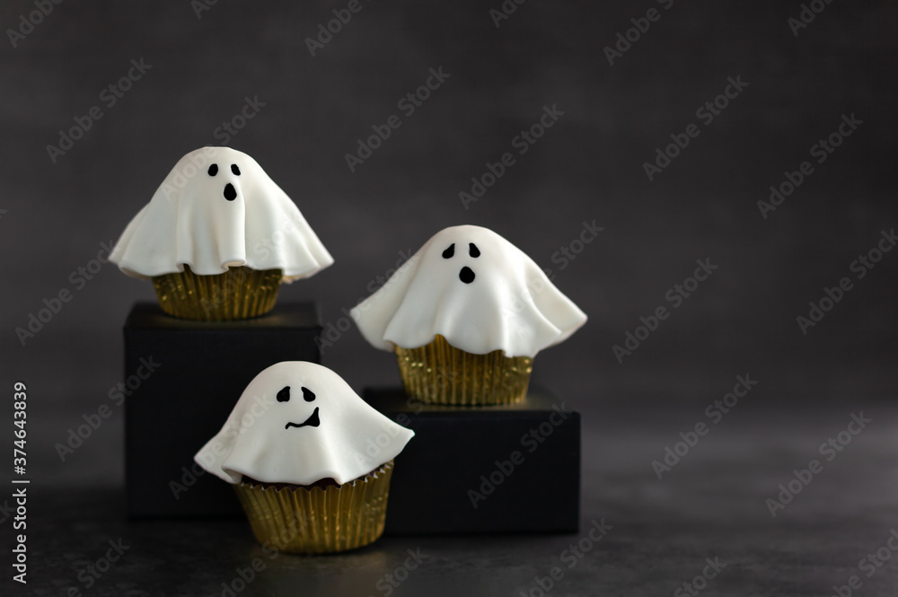 Halloween fondant ghost cupcakes on black podiums. Halloween party food idea.