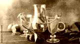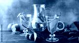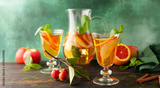 Apple cider cocktail with red oranges and spices in glasses and jug on table. Concept of autumn and winter drinks.