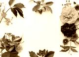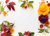 Autumn composition with flowers, leaves and berries on white background. Flat lay, copy space.