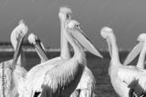 A group of several large pink pelicans stand in the lagoon on a sunny day