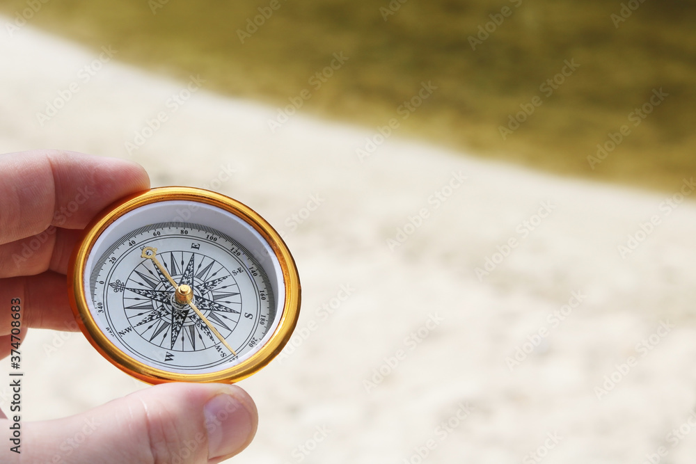classic navigation compass in hand in summer against background of sandy beach as symbol of tourism with compass, travel with compass and outdoor activities with compass