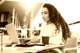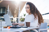 Turkish hipster girl sitting at street coffee shop and using wifi internet connection for doing distance job with freelance project, skilled female user making online booking and banking on netbook
