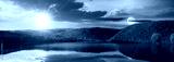 day and night time change concept above mountain lake among the forest. trees in colorful foliage. beautiful panorama in autumn. clouds and sky with sun and moon reflecting in the water