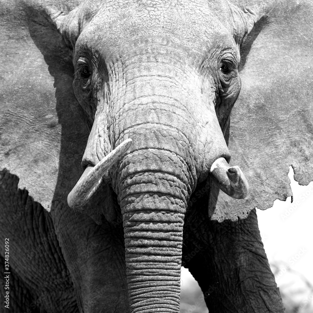 A close up of a single large Elephant (Loxodonta africana) in Kenya. Front on. Black and White. Sqaure Composition.