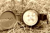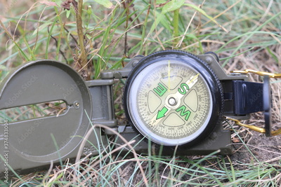 round compass on background of summer grass as symbol of tourism with compass, travel with compass and outdoor activities with compass