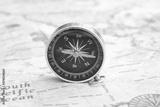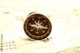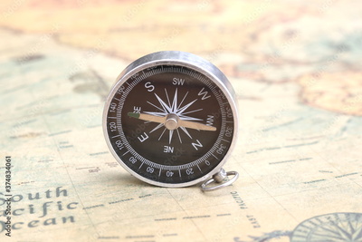 Classic round compass on background of old vintage map of world as symbol of tourism with compass, travel with compass and outdoor activities with compass