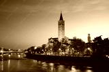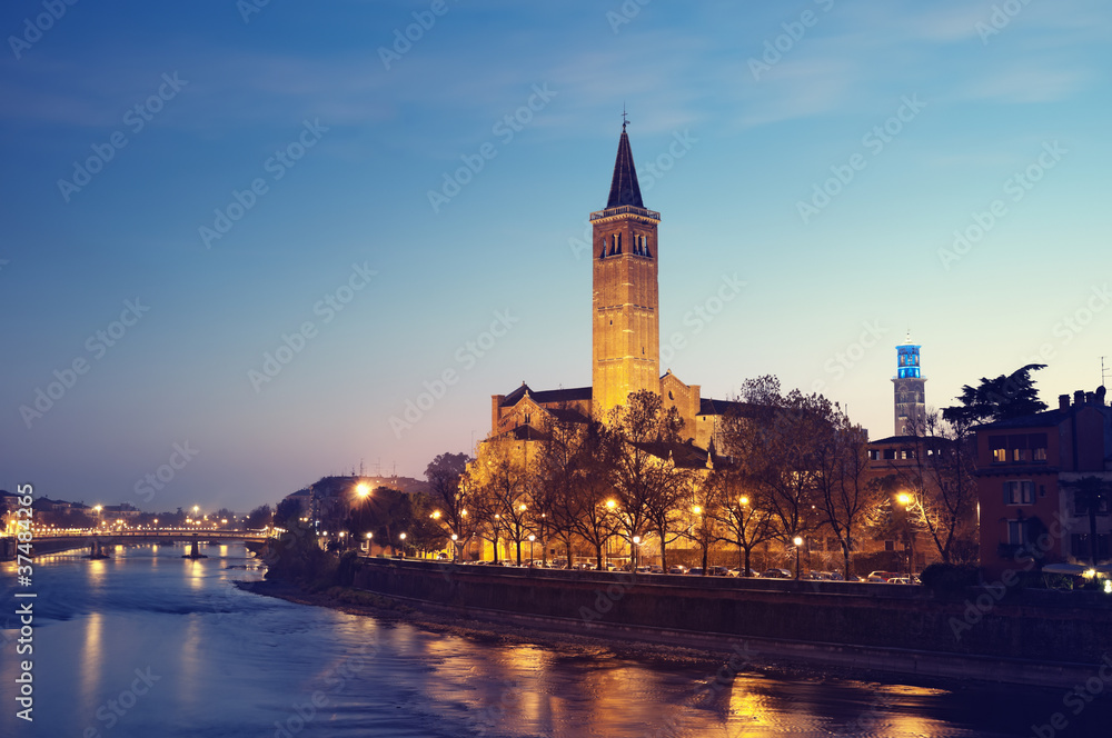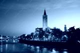 Sant'Anastasia church and Adige River at night.