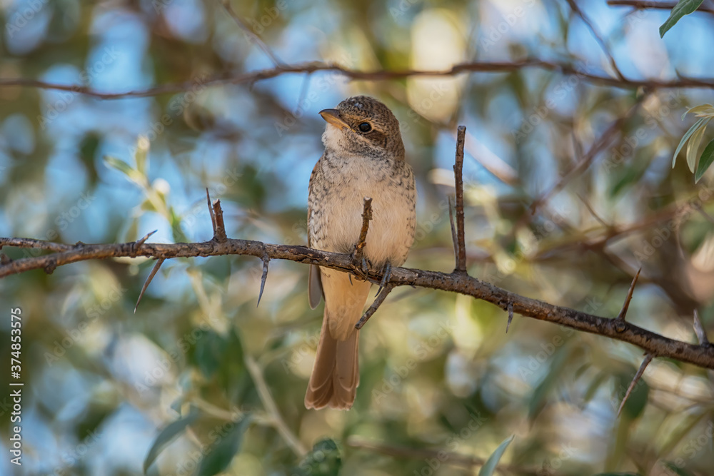 Beautiful Red-backed shrike, wild bird sits on tree brunch