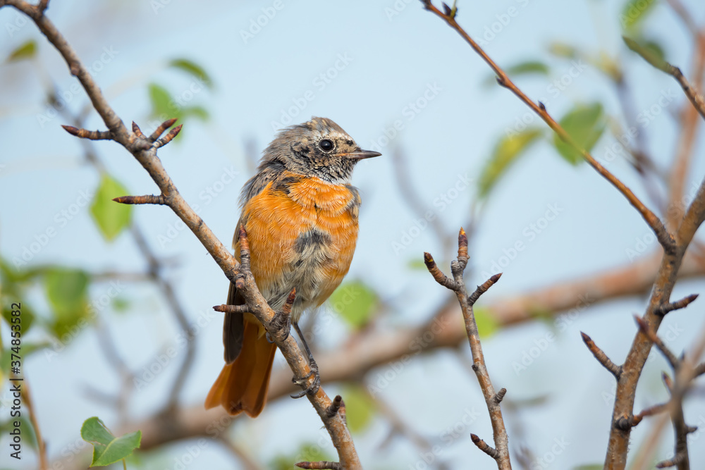 Cute Common redstart sitting on tree branch