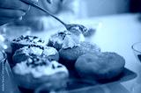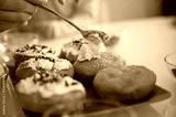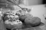Decorating delicious home made vegan doughnuts with white chocolate topping