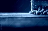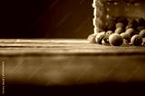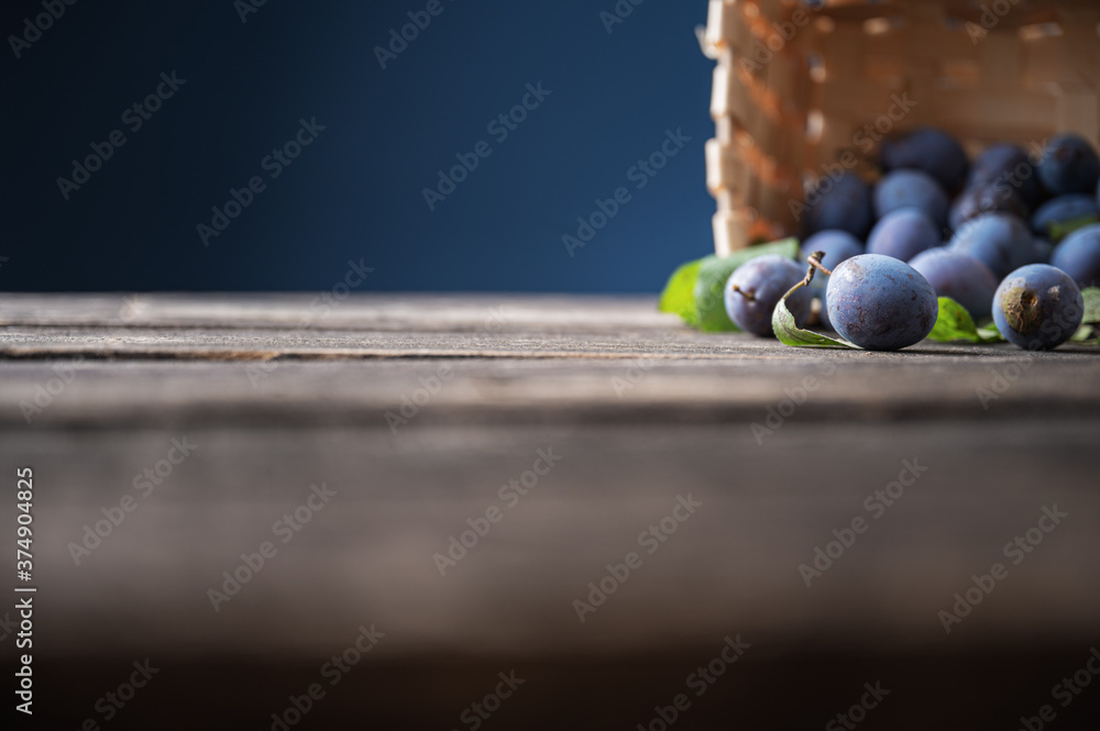 Home grown organic plums scattered out of a wicker basket on rustic wooden boards