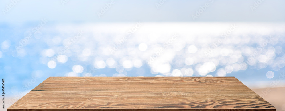 summer background.Empty perspective wood table with blur sea and sky bokeh background, banner mockup template for display of product