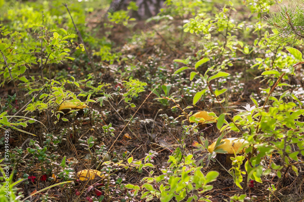 Group of mushrooms boletus, in shrubs in the coniferous forest at sunny morning, mushroom picking season