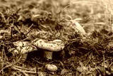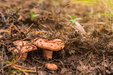 Group of saffron milk cap in the fallen needles and pinecones in the forest, mushroom picking season, selective focus