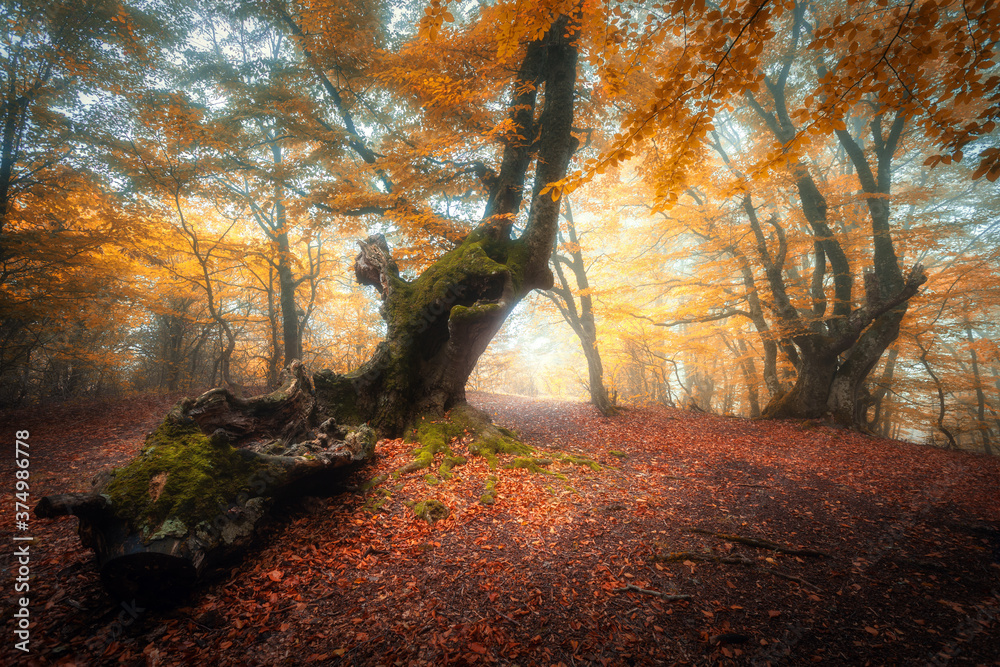 Trail in beautiful forest in fog at sunrise in autumn. Colorful landscape with enchanted trees with orange and red leaves. Scenery with pathway in dreamy foggy forest. Fall colors in october. Nature