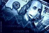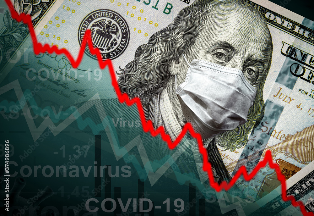 COVID-19 impacts to business: dollar money, mask and graph of stock market recession during coronavirus pandemic