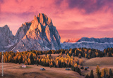 Beautiful mountains with lighted peaks and red sky at sunset. Autumn landscape with small wooden houses, mountain valley, meadows with green grass, fall trees, high rocks. Alpe di Siusi in Italy
