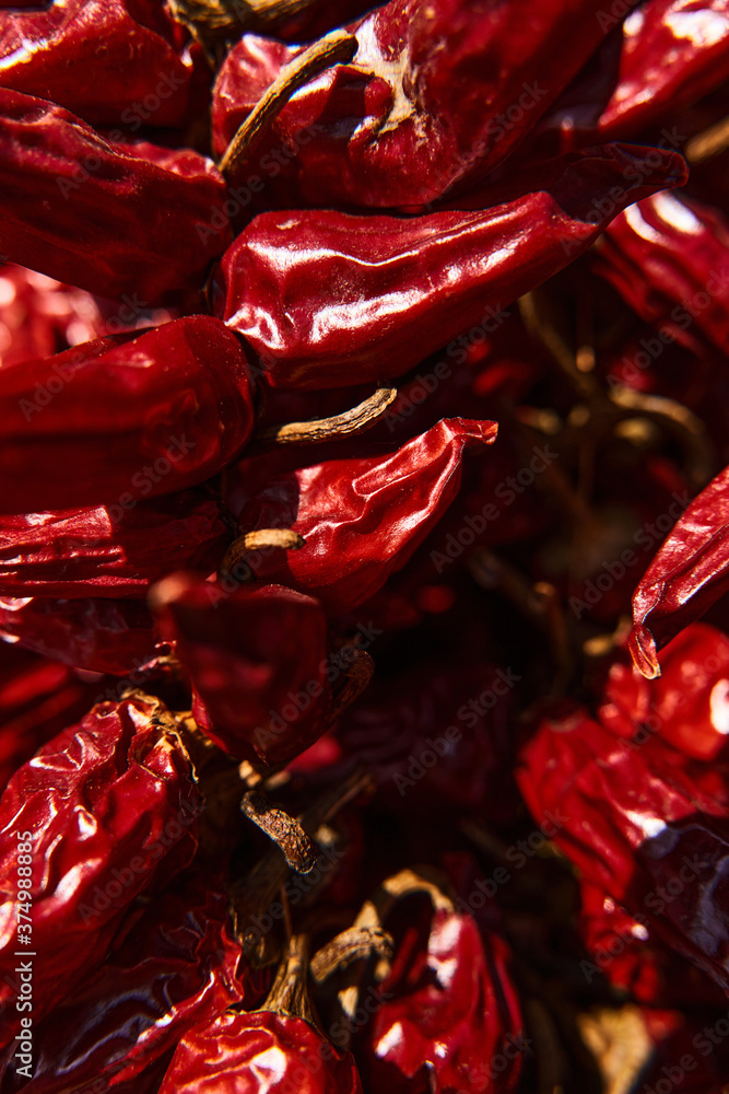 Closeup shot of bundle of red hot chilli peppers drying, hanging down from the ceiling in famous pepper house in Tihany, Hungary.