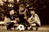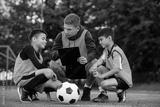 Professional soccer coach tells the strategy of football game to his attentive teen players at stadium during training.