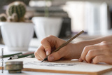 The girl makes sketches with an old fountain pen in the album. Creativity concept.