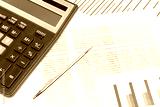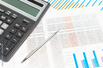 Finance and business concept. White calculator on financial graphs on office desk, paperwork binder. Accounting budgeting or market analysis. Web banner with copy space. Minimal