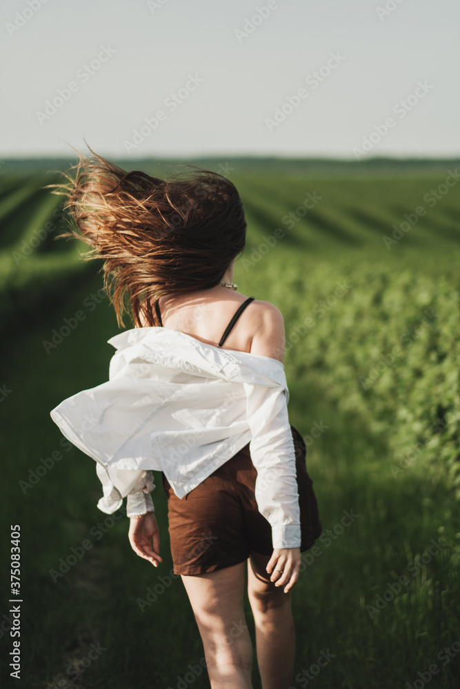Young Adult Girl in White Shirt and Brown Shorts Having Fun in the Green Currant Fields