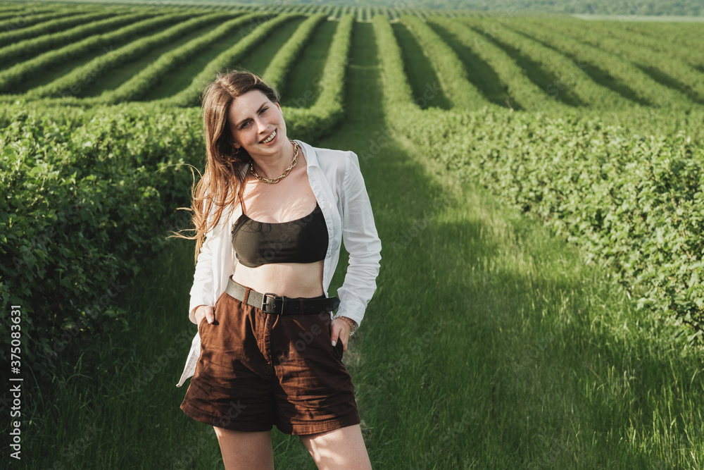 Young Adult Girl in White Shirt and Brown Shorts Having Fun in the Green Currant Fields