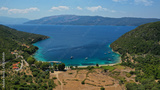 Aerial drone photo of bay and beach of Polis in Northern part of Ithaki or Ithaca island a safe sail boat anchorage, Ionian, Greece