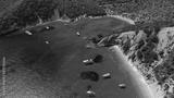 Aerial drone photo of turquoise paradise sandy beach and bay of Filatro a safe sail boat anchorage in Ithaki or Ithaca island, Ionian, Greece