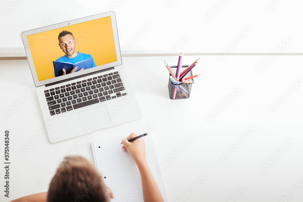 school at home through online homeschooling. the child is sitting at the computer
