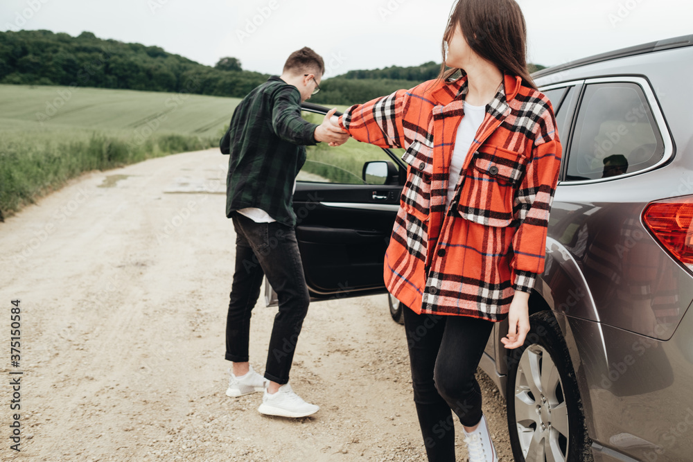 Young Beautiful Couple Having Fun Near the Car, Travel and Roadtrip Concept