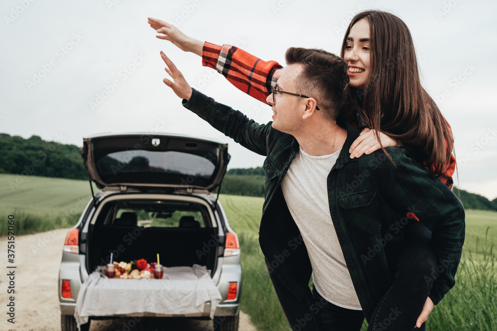 Young Beautiful Couple Having Fun Near the Car, Travel and Roadtrip Concept
