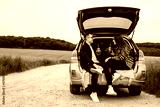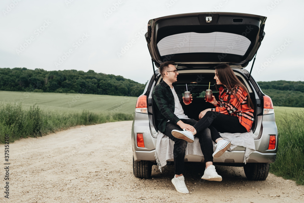 Young Beautiful Couple Sitting in the Car Trunk and Enjoying the Roadtrip, Picnic Concept
