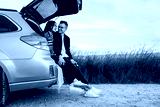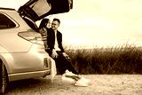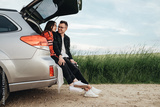Young Beautiful Couple Sitting in the Car Trunk and Enjoying the Roadtrip