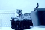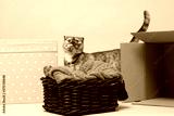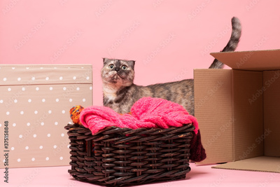 Small shy cat hiding between boxes. Studio shot