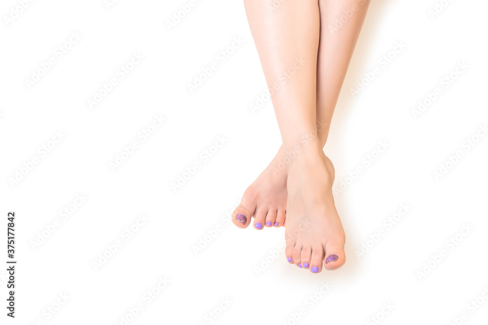 Perfect clean female feet . Beautiful and elegant groomed feet with a bright purple pedicure. isolated on white background.