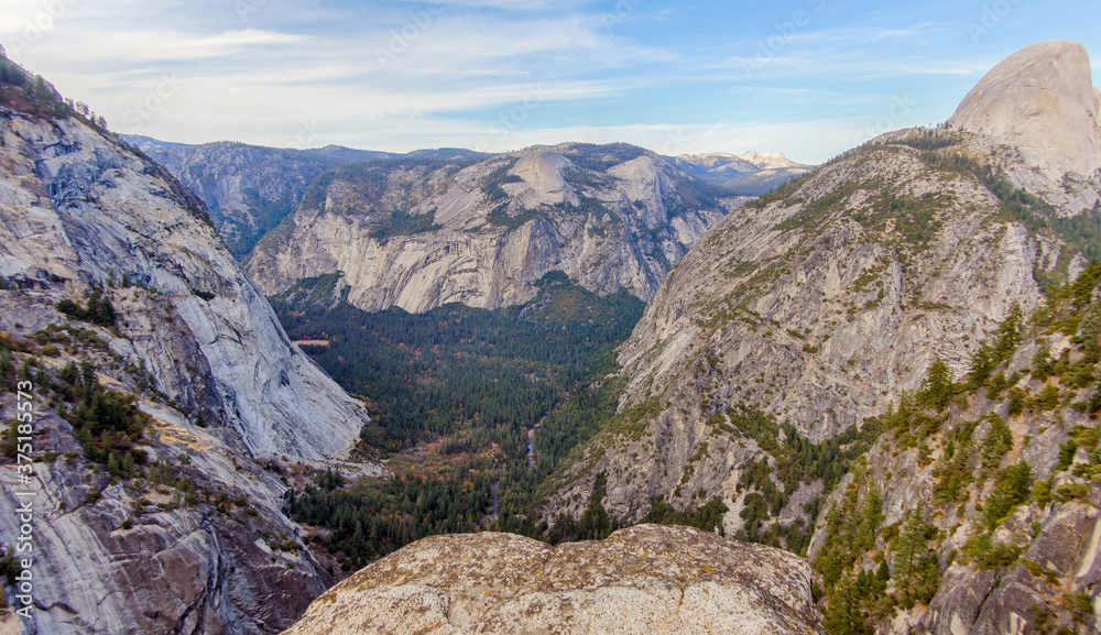 Half Dome (right) and Valley floor as seen from Taft Point at Yosemite National Park.
