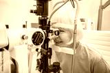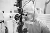 Elderly woman eyesight test with binocular slit-lamp. Checking retina of a female eye close-up. Ophthalmology Clinic