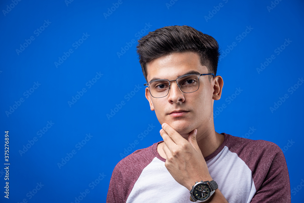 Joven con gafas en fondo azul
