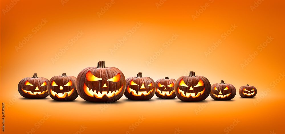 Nine halloween, Jack O Lanterns, with evil spooky eyes and faces isolated against a orange and yellow lit background.
