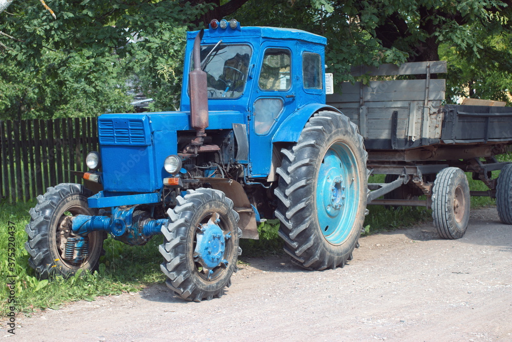 Working blue tractor with trailer
