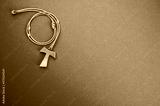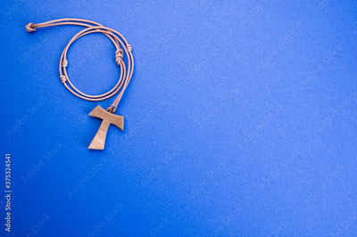 Closeup of a wooden tau cross necklace isolated on a blue background