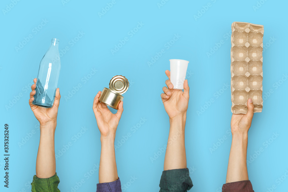 Different types of waste in the hands on a blue background.