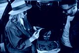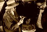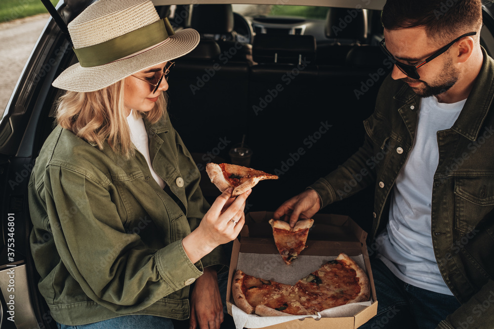 Man and Woman Sitting in the Trunk of Their Car and Eating Pizza