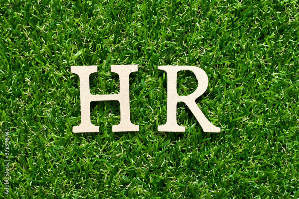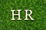 Wood alphabet letter in word HR (Abbreviation of human resource) on green grass background