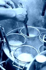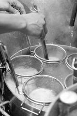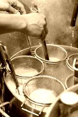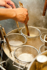 麺茹でをする調理師の手元