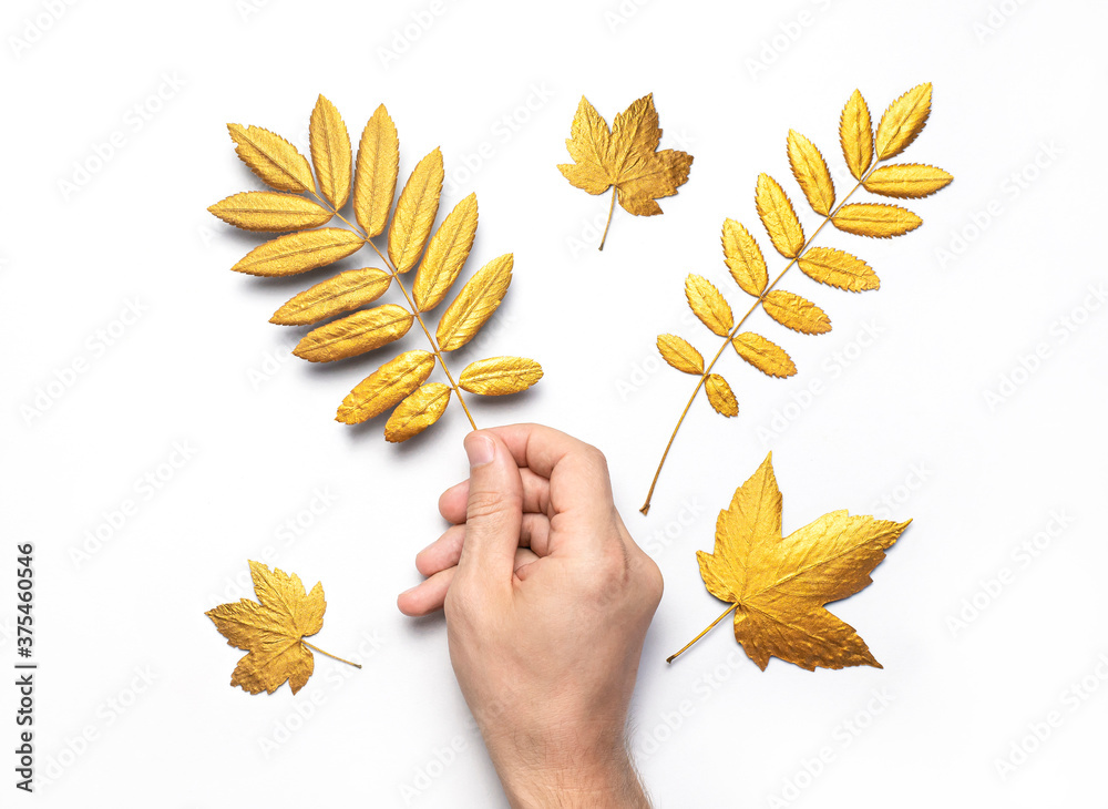 Male hands hold golden autumn leaves on white background top view copy space. Autumn minimalistic concept, Fall. Autumn background. Minimal floral design, Autumn composition. Golden twig